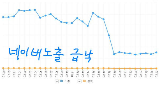 블로그의 인터페이스를 건드리거나 특별한 일을 한 적은 없는데 노출이 절벽으로 떨어 졌습니다.