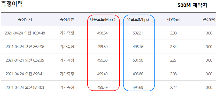 아래에 다운로드및 업로드 속도 테스트 결과를 캡쳐 한 이미지를 올립니다.