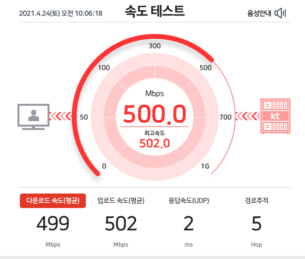 아래에 다운로드및 업로드 속도 테스트 결과를 캡쳐 한 이미지를 올립니다.
