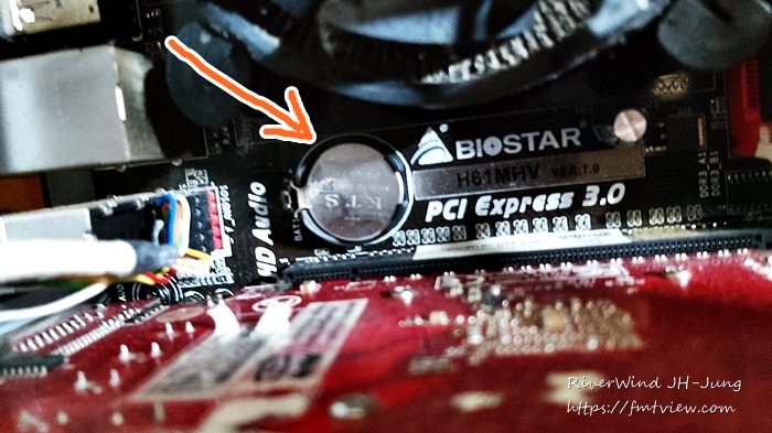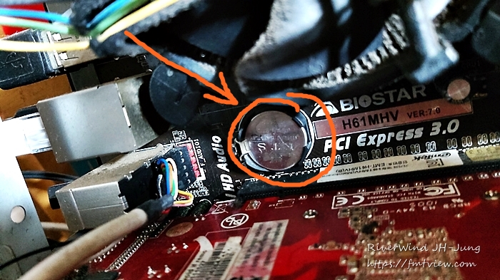 PC 케이스를 열고 잘 찾아보면 동그란 배터리를 보게 됩니다.