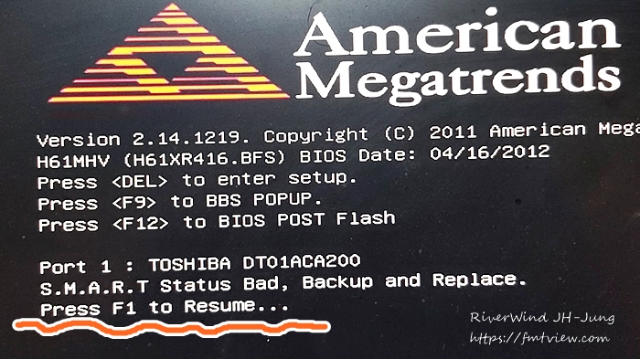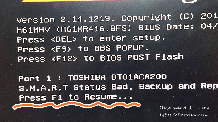 컴퓨터를 쓰다 보면 우연히 부팅이 멈추고 F1을 눌러야 진행된다는 텍스트 도스 화면이 나오고 멈추는 경우가 발생합니다.