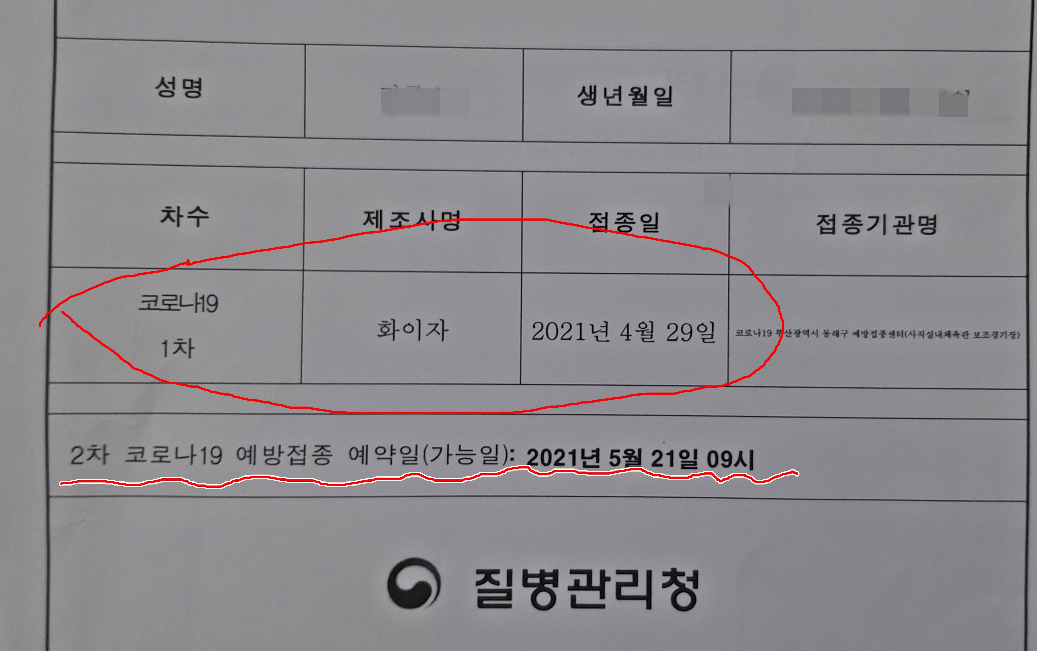 나오면서 신분 확인하고 코로나 19 화이자 백신 1차 접종 확인서 받았습니다.