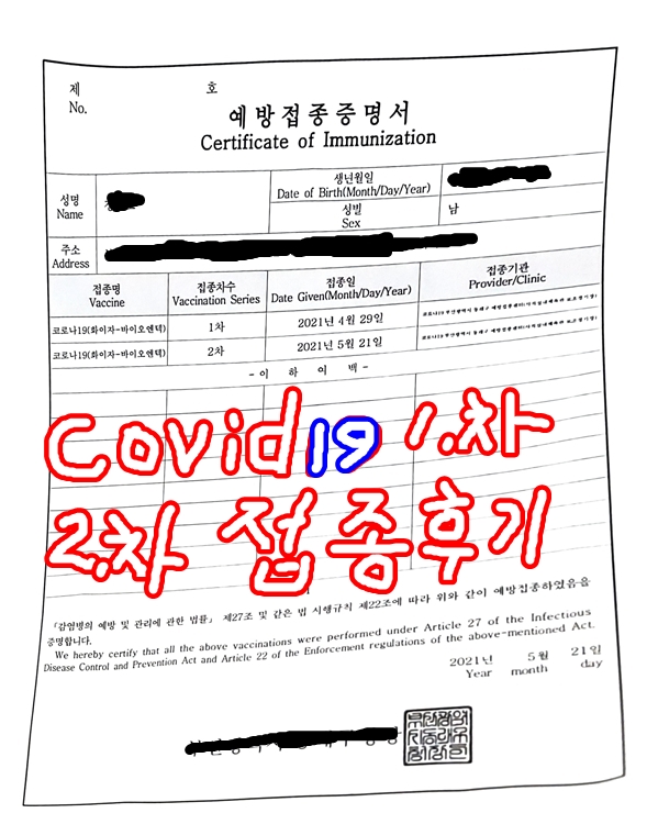1차 접종 4월 24일 오전 9시 30분에 마친 후 어제 5월 21일 오전 9시 30분에 2차 접종했습니다.