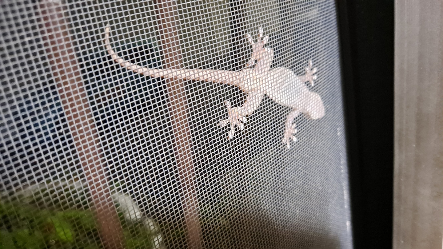 창문을 여니까 방충망에 도마뱀 한 마리가 허연 배를 드러내고 붙어있네요.