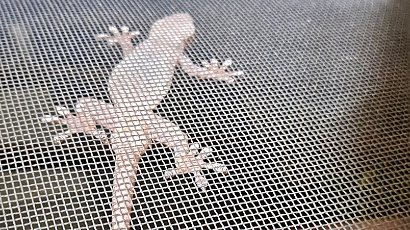 방충망에 붙은 도마뱀