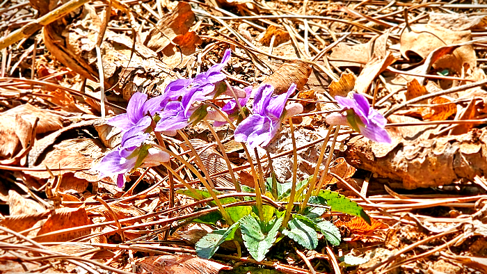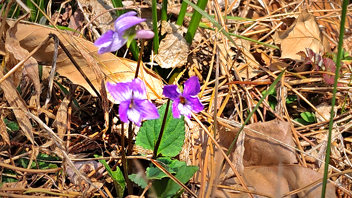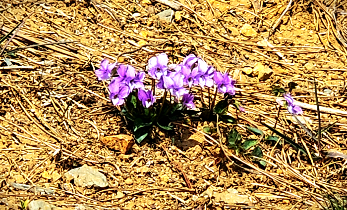 A spring road with blooming violets