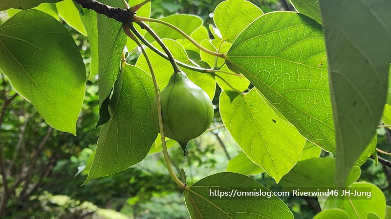 한여름 현재 녹색 유동 열매가 탁구공보다 조금 크게 달린 유동나무를 보며 자세히 알아봅니다.