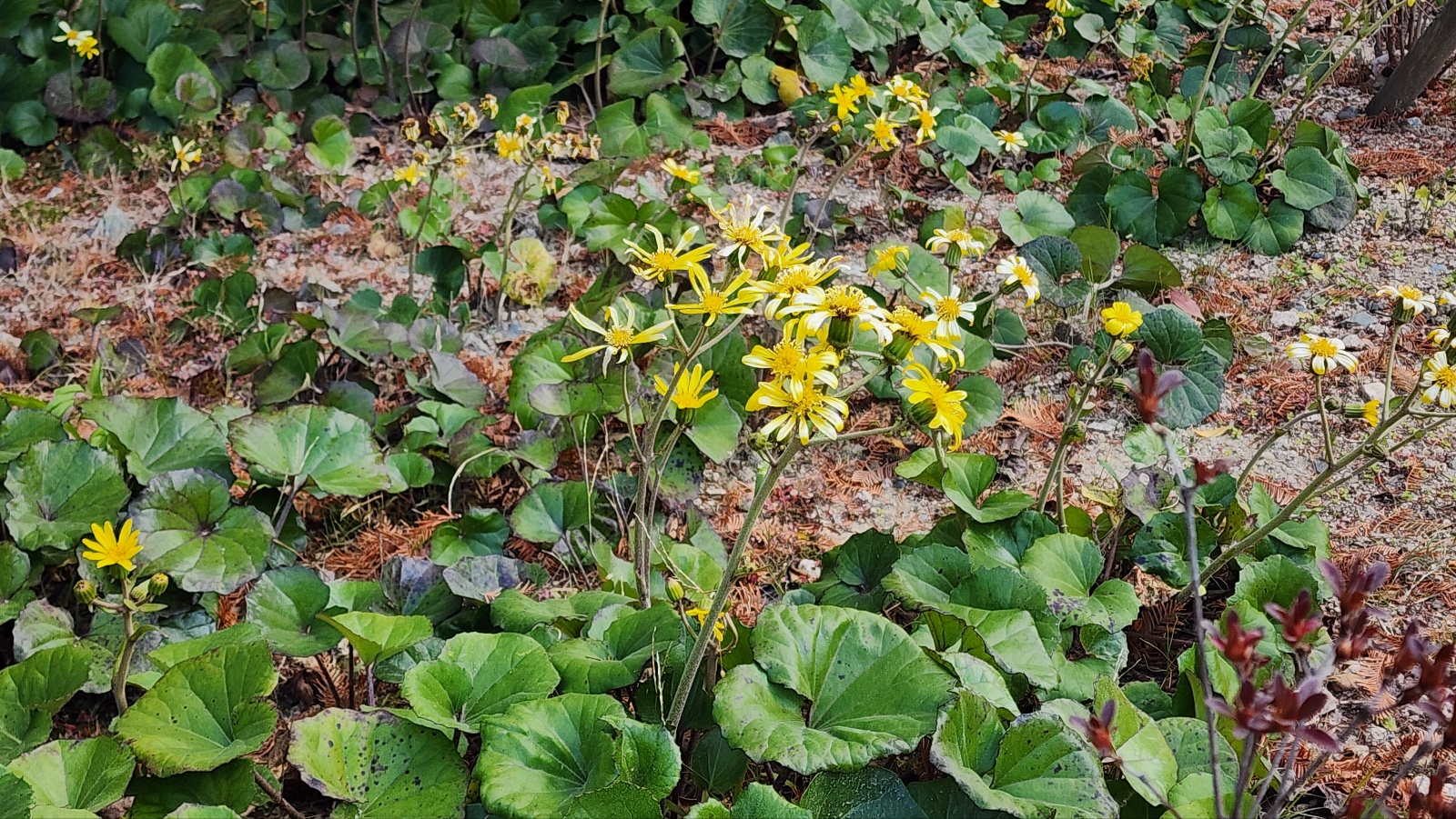 털머위 꽃: 늦가을에 노란색의 꽃이 피기 시작해서 한 겨울에도 줄기차게 핍니다. 언듯 보면 곰취와 비슷하게 생겼는데 그래서 말곰취라는 이명이 있나 봅니다.