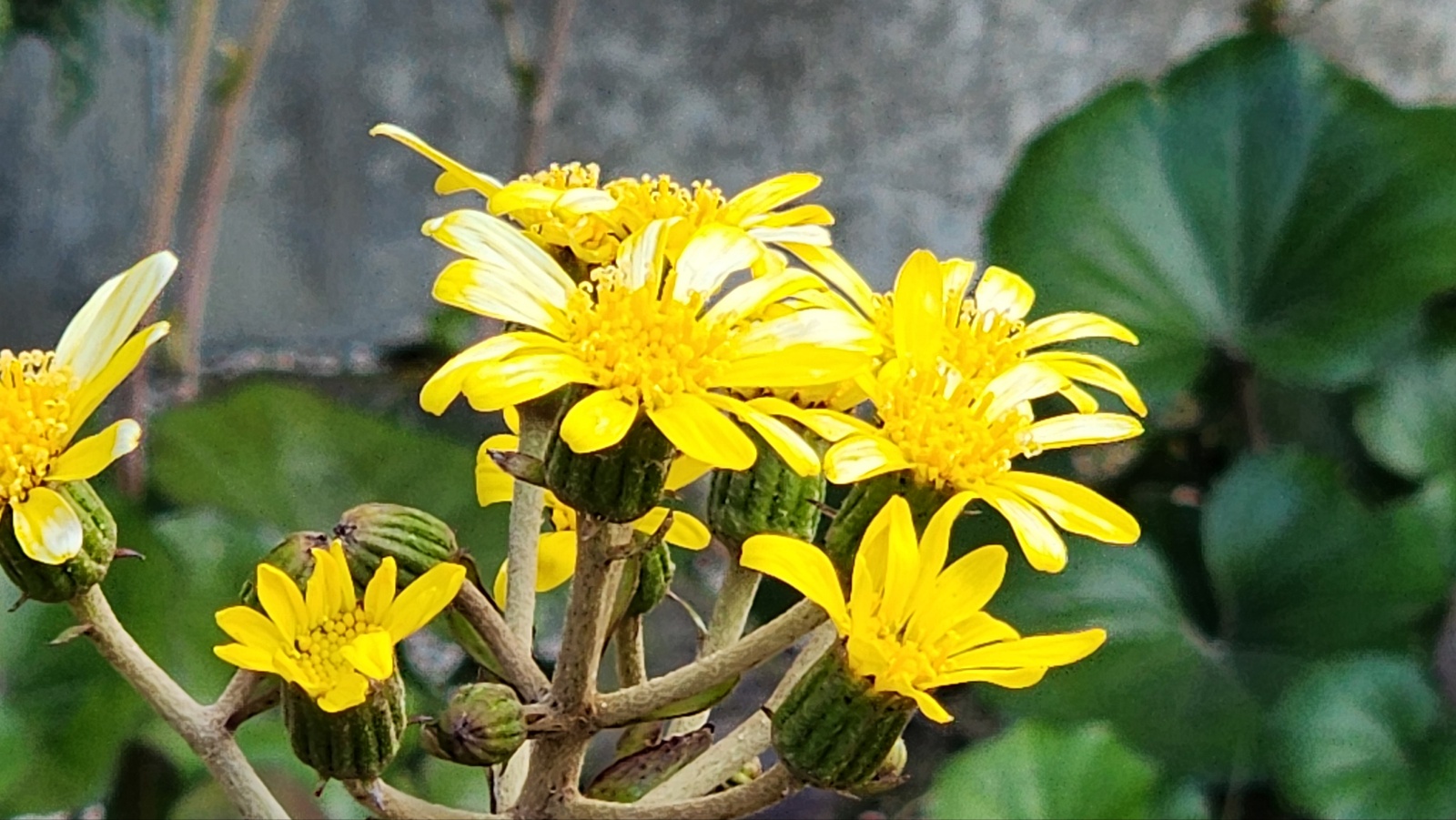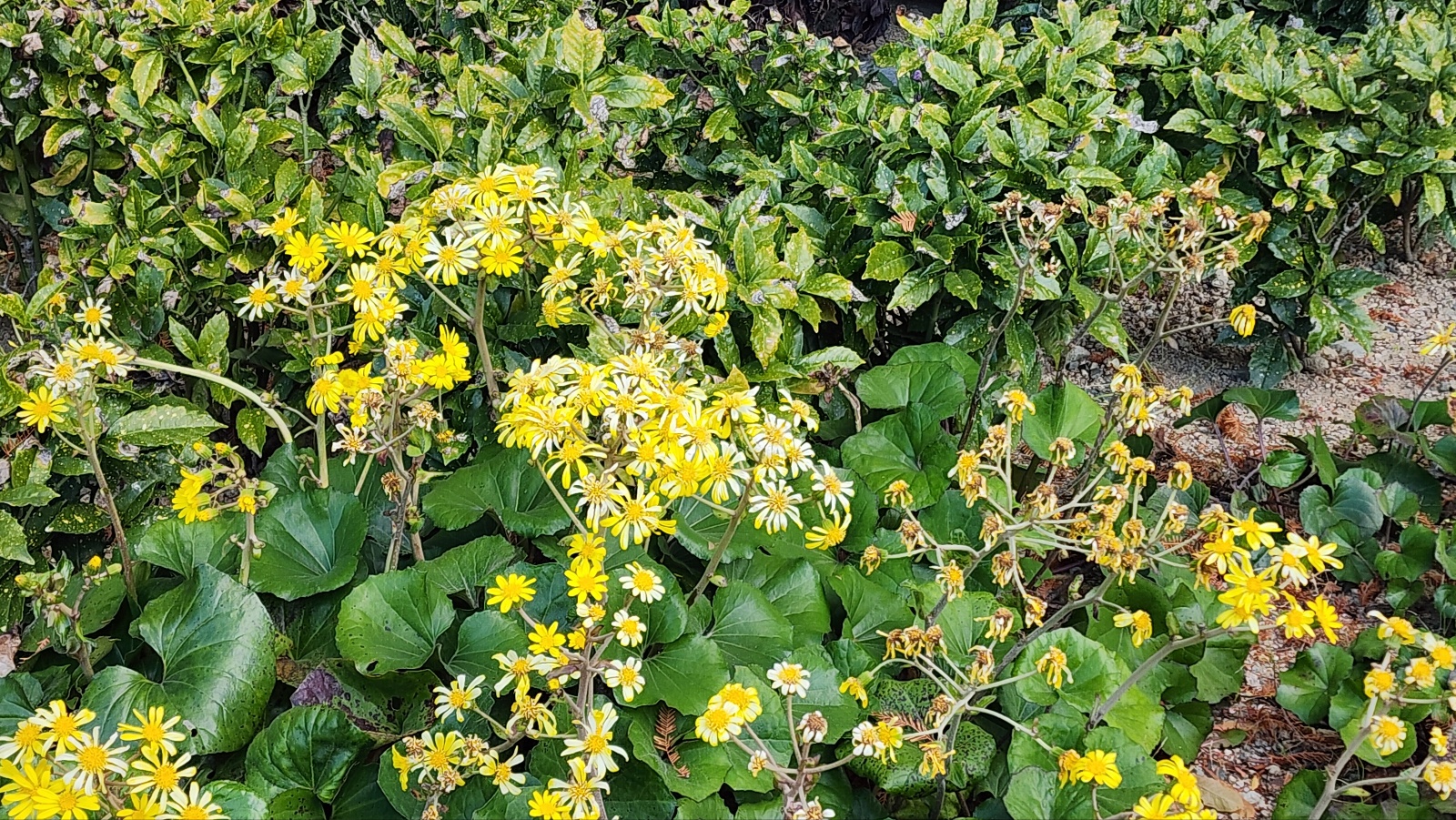 털머위 꽃: 늦가을에 노란색의 꽃이 피기 시작해서 한 겨울에도 줄기차게 핍니다. 언듯 보면 곰취와 비슷하게 생겼는데 그래서 말곰취라는 이명이 있나 봅니다.