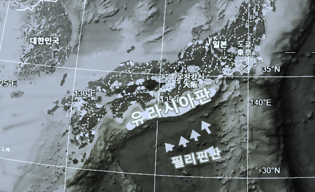 지질 구조: 필리핀해판이 유라시아판 밑으로 섭입(subduction)하면서 에너지가 축적되는 구조.