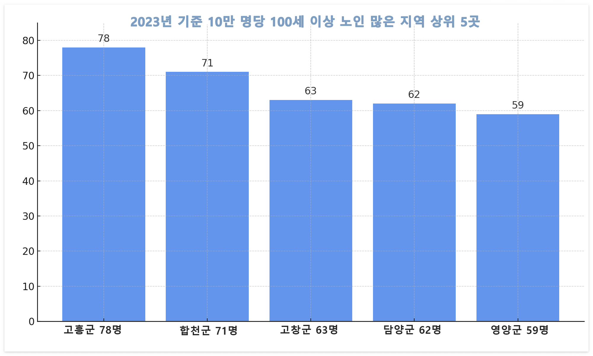 📌 2023년: 고흥군 – 인구 10만명당 78명, 총 100세 이상 인구 중 가장 높은 비율