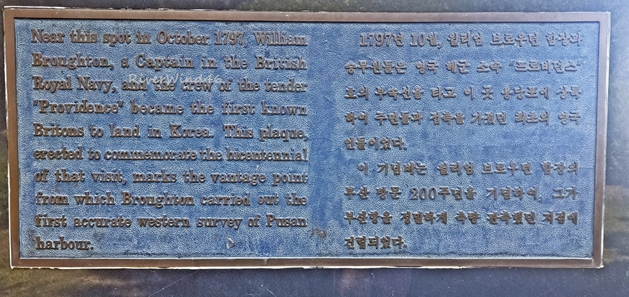 "이 기념하는 윌리엄 브로우턴 함장의 부산 방문 200주년을 기념하여, 그가 부산항을 정밀하게 측량 관측했던 지점에 건립되었다.