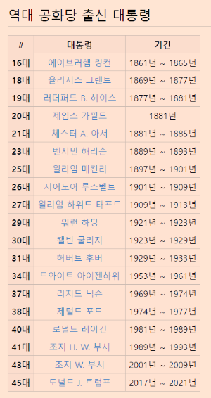 미국 정당정치가 시작된 후 공화당은 에이브라험링컨을 필두로 도널드 트럼프 대통령까지 미국을 19번째 집권한 것입니다.
