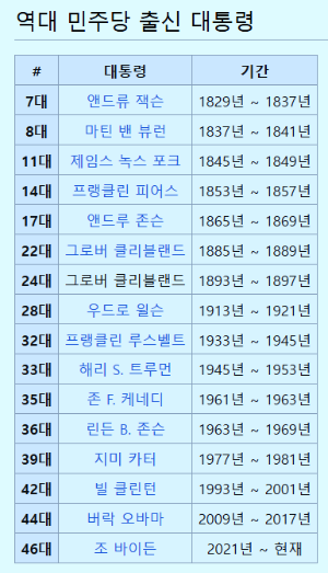 민주당은 앤드류 잭슨을 필두로 이번 조 바이든 대통령까지 총 16번 집권한 것입니다.